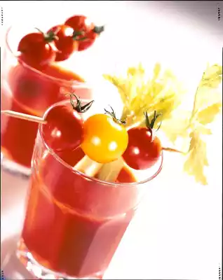 Clean and wash the celery. Wash cherry tomatoes and put them on skewers. Season tomato juice with Tabasco, Worcester sauce and vinegar. Mix with stock. Pour tomato drink into glasses.