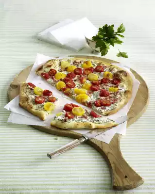 Halve the dough and roll out round (approx. 30 cm Ø). Spread half of the goat cheese on a base and cover with half of the tomatoes. Sprinkle half of the bacon on top and season with pepper. Bake in the preheated oven (electric cooker: 250 °C/ convection oven: 225 °C/ gas: level 5) for 10-12 minutes. In the meantime, process the remaining dough and topping in the same way and bake. Serve the finished tarte flambée warm