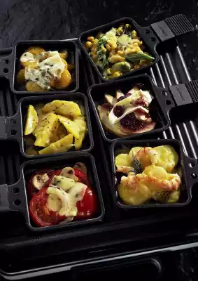 Clean, wash and slice the tomatoes and mushrooms. Cut cheese into slices as well. Put some tomato and mushroom slices in a pan. Season with salt and pepper. Cover each with a slice of cheese and bake under the raclette grill until the cheese has melted