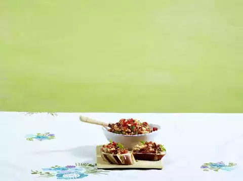 Knead in whole tomatoes, spring onions and pine nuts. Season with salt, pepper and sweet paprika. Fits e.g. to lye pastry.