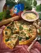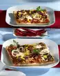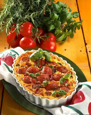 Roll out the dough about 3 cm larger than the form (about 28 cm long). Put it in and press it up at the edge. Spread the tomatoes on top. Pour egg-cream over it. Sprinkle with bacon. Bake in a hot oven (electric cooker: 200 °C/circulating air: 175 °C/gas: level 3) for 50-60 minutes. Garnish with remaining basil