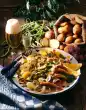 Cut the goat cheese into about 8 slices. Carefully mix the prepared salad ingredients and serve with the goat's cheese. Drizzle marinade over it. Sprinkle with coarse pepper and garnish with orange slices