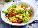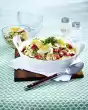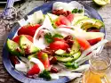Onions peel, halve and in fine strips cut. Wash and clean the tomatoes and cut them into slices or halve them. Wash parsley, shake dry, pluck leaves from the stalks.