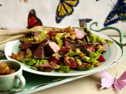 Arrange salad with meat and potato croutons.