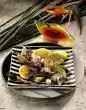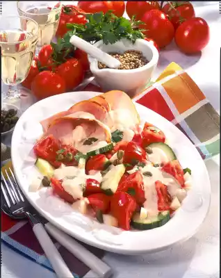 Wash and clean the tomatoes and cucumber and cut into large pieces. Peel onion and cut into medium-sized cubes. Wash parsley, dab dry, pluck and cut into small pieces. Mix the tomatoes, cucumber, onions and tuna sauce, season to taste if necessary and arrange on a plate with turkey slices. Garnish with remaining capers and parsley