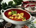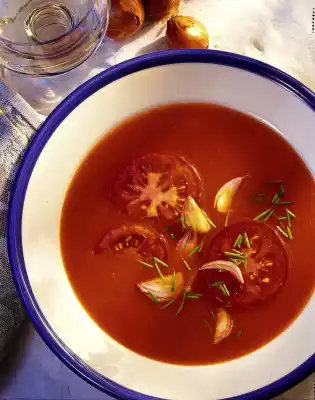 Add the tomatoes and tomato paste, pour on the stock and sherry and cook for 20-25 minutes. Pass through a sieve. Season to taste with salt, pepper and sugar. Wash the chives, dab dry and cut into small rolls.