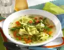 Preparation..: Peel or clean and wash the soup vegetables. Peel shallots and cut into slices. Tomatoes wash, remove stalks. Cut tomatoes, except for 2 pieces, into large pieces. Fry soup vegetables and shallots (some slices are left over) in hot fat.