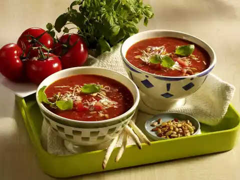 Roast the pine nuts in a pan without fat until golden brown, take them out. Wash, clean and seed the tomatoes. Cut the flesh into small cubes. Season soup with salt, pepper and sugar and puree briefly.
