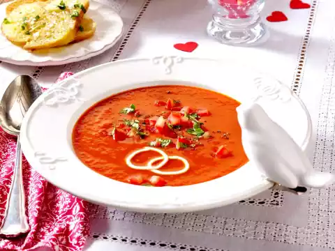 Arrange the soup in plates, sprinkle with the tomato-basil mixture. Garnish with crème fraîche if desired. Pour the crème fraîche into a piping bag with a small perforated spout and spray 2 rings onto the soup surface.