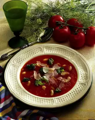 Drain the broccoli on a sieve. Add the beans and broccoli to the soup, bring to the boil again and serve sprinkled with coloured pepper and parmesan slices as desired.