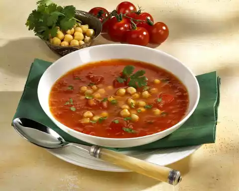 Drain the chickpeas. Coarsely mash the soup, add the chickpeas and warm them up. Wash the coriander and dab dry. Set aside some coriander for garnishing. Chop the rest and stir into the soup.