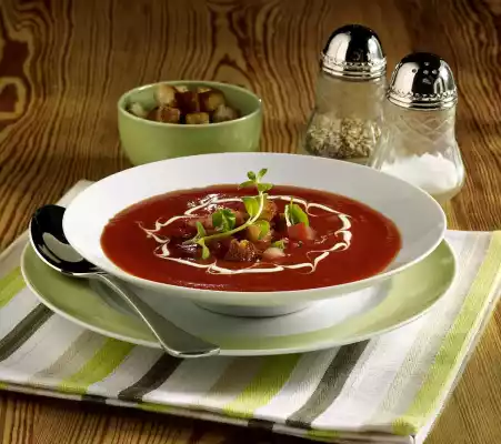 Wash, clean and dice the tomato. Add herbs to the soup and puree finely with a blender. Add tomato cubes to the soup and arrange in plates. Fill crème fraiche into a disposable piping bag or freezer bag, cut off the tip.