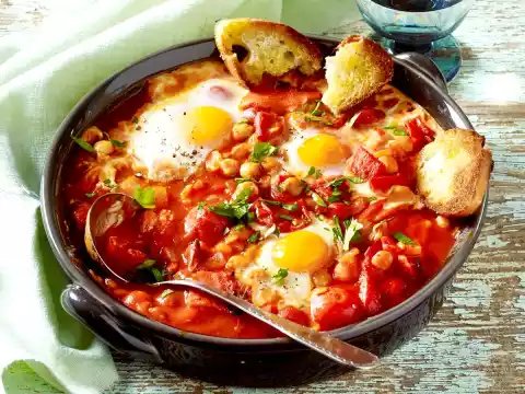 Season to taste with chilli, paprika powder, cumin, sugar and salt. Pour everything into an ovenproof casserole dish (24 cm Ø; approx. 5 cm high). Beat the eggs and let them slide carefully into the baking dish.
