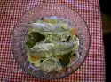 Rinse the tomatoes and cut off a lid. Hollow out the inside of the tomatoes. Dab tomatoes dry inside with kitchen paper and season with pepper.