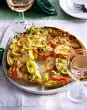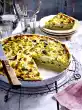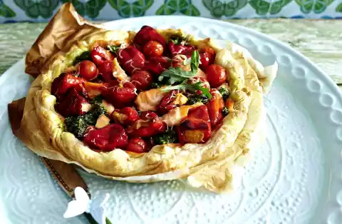 Drain the peppers well. Wash the tomatoes and also drain them. Spread about 2/3 of the salmon slices on the tart. Pour the cream cheese icing over it. Spread pepperoni, tomatoes, remaining pesto and salmon on top and sprinkle with remaining cheese. Bake the tart on the lower shelf in a preheated oven (electric cooker: 200 °C/ convection oven: 175 °C/ gas: see manufacturer) for approx. 35 minutes. Remove from the oven and let rest for about 5 minutes. Wash the rest of the basil, dab dry and pluck the leaves from the stalks. Remove the tart from the tin and garnish with basil