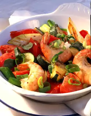 Remove from the pan. Fry the zucchini and leek onion pieces in the frying fat. Add tomatoes and braise for about 10 minutes. Season vegetables with salt, pepper and oregano. Add shrimps shortly before the end of the cooking time and heat up again. Sprinkle with spring onion rings shortly before serving