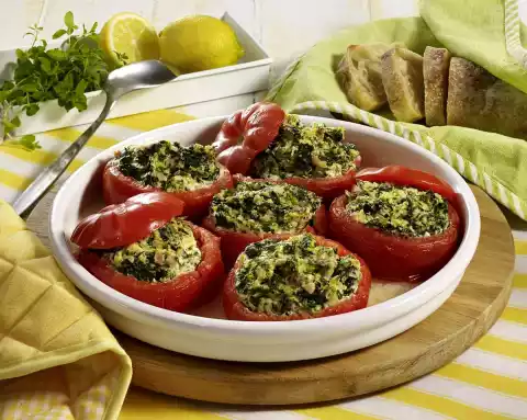 Season with oregano, salt, pepper and nutmeg. Wash the tomatoes, cut off the lid, hollow out the tomatoes and fill them. Put them side by side in a greased casserole dish, put the lid next to them. Cook in the preheated oven (electric cooker: 175 °C/ convection oven: 150 °C/ gas: level 2) for about 30 minutes. Ciabatta bread tastes good with it