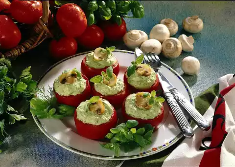 Wash the herbs, dab dry and chop finely, except for something to garnish. Stir the herbs and chopped mushrooms into the cream cheese. Season with salt and pepper. Add the cream cheese filling to the tomatoes. Arrange the tomatoes on a plate. Garnish with mushroom slices and remaining herbs