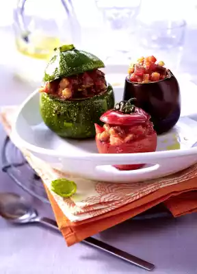 Fill the zucchini, tomatoes and aubergines with the vegetable mixture. Place in an ovenproof dish, drizzle with 4 tablespoons of olive oil and bake in a preheated oven (electric range: 175 °C/ convection oven: 150 °C/ gas: see manufacturer) for 30-40 minutes. Remove the vegetables, let them cool down a little, garnish with basil and serve