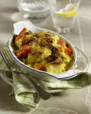 Put the carrots and leeks on a sieve and collect the vegetable water. Measure out 300 ml of vegetable water. Mix the vegetables and put them into one large or four small, greased casserole dishes. Peel and finely chop the onion.
