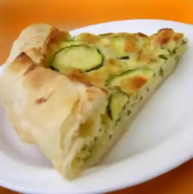 Preheat oven to 180°C. Grease baking tin and line with puff pastry. I take a round springform pan. Peel onions and cut or slice them thinly. Wash the zucchini and cut or slice into thin round slices.