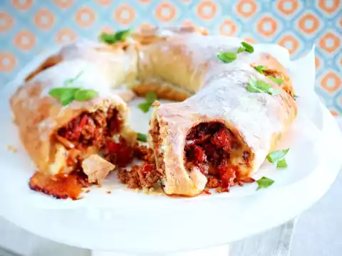 Spread the chopped tomatoes, cheese and pine nuts on the dough. Roll up from the long side. Place the roll on the tray. Cut several times on one side until the middle, but do not cut through completely.