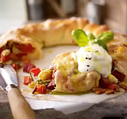 Season with a little salt and pepper. Crumble feta over it. Roll up the pizza dough from the long side. Remove the baking paper supplied. Cut the dough roll several times on one long side, but do not cut through.