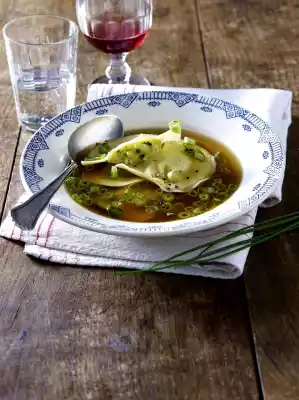 Clean and wash spring onions and cut into fine rings. Bring the stock to the boil. Arrange tortelli, pour broth over them and sprinkle with spring onions