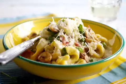 Bring 3 l of water to the boil with approx. 2 tsp. salt. Peel onion and garlic, dice finely. Clean the mushrooms, wash if necessary and cut into slices. Cut ham into strips. Cook tortellini in boiling salted water according to package instructions.