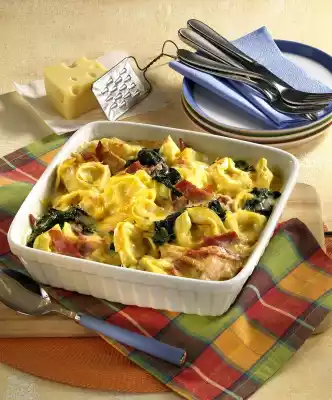 Place the tortellini, spinach and ham in an ovenproof casserole dish, pour the sauce over it and sprinkle with cheese. Gratinate in the preheated oven (electric cooker: 200 °C/ convection oven: 175 °C/ gas: level 3) for approx. 15 minutes.