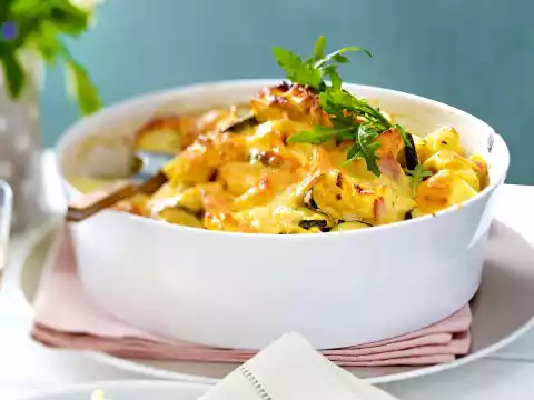 Finely grate the cheese. Mix sauce, tortelloni and zucchini. Place in a greased baking dish, sprinkle with cheese and bake in a preheated oven (electric range: 200 °C/ convection oven: 175 °C/ gas: level 3) for 25-30 minutes. Remove from the oven and serve garnished with rocket