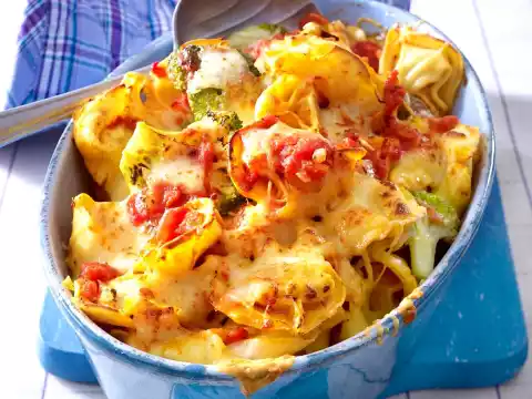 Spread the tortellini and broccoli in the dish. Pour tomato sauce over it and spread mozzarella on top. Bake in a hot oven for about 10 minutes.