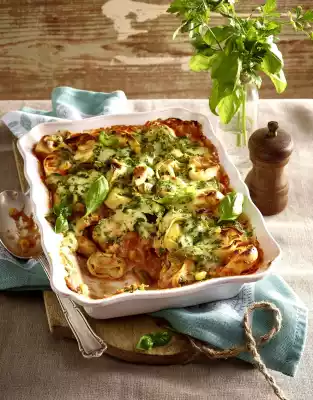 Put the tomato sauce in a pot and heat it up. Distribute tortellini, corn and paprika in an ovenproof dish (approx. 20 x 30 cm). Pour hot sauce evenly over the top and bake in a preheated oven (electric cooker: 200 °C/ circulating air: 175 °C/ gas: see