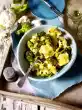 In the meantime cut the mozzarella into small cubes. Wash herbs, shake dry, pluck leaves from the stalks and, except for a few basil leaves for garnishing, cut finely. Mix with the mozzarella in a bowl.
