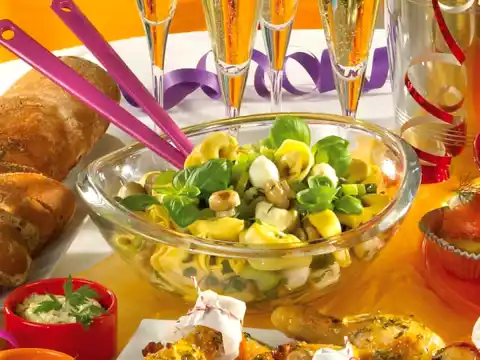 Cook the tortellini in 2 portions in boiling salted water for about 2 minutes. Drain. Clean, wash and chop the celery. Mix the prepared ingredients together with the marinade and leave to stand for at least 30 minutes