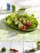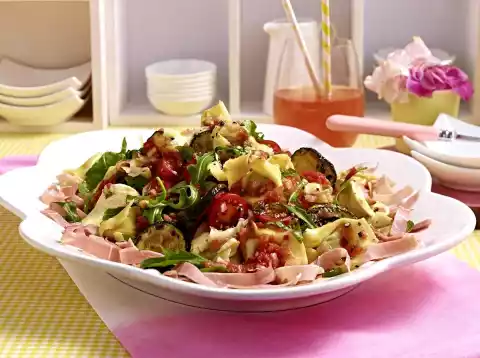 Prepare tortellini in boiling salted water according to the instructions on the packet. Cut mozzarella into thin slices. Carefully mix the salad ingredients, except for the cooked ham. Arrange ham and salad on a plate