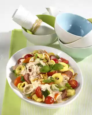 Season the sauce with salt and pepper. Mix cooled tortellini, peppers, spring onions, tomatoes and cabanossi with the sauce. Arrange on a large platter, sprinkle with remaining pine nuts and garnish with basil.