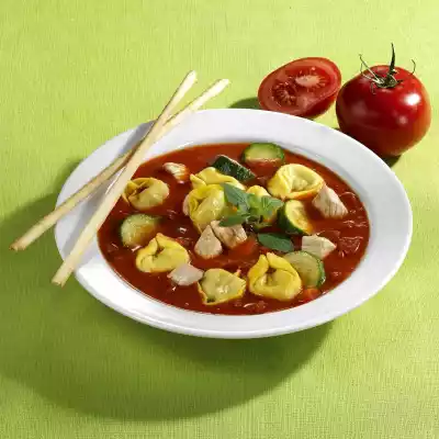 Add tomato pieces with tomato puree and vegetable stock to the onions and simmer gently for about 15 minutes. Cook the tortellini in boiling salted water for about 12 minutes. Wash and clean the zucchini and cut into thick slices.