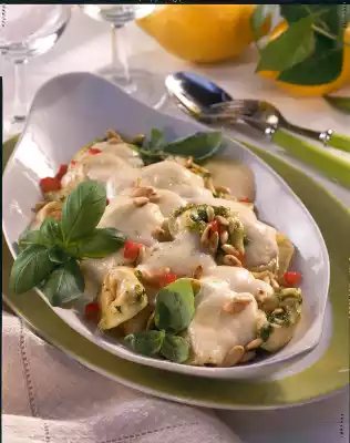 For the pesto, wash the basil and chop it roughly. Peel the garlic and press it through a garlic press. Roast pine nuts in a pan until golden brown. Puree half the pine nuts, basil, garlic, parmesan and olive oil in a blender. Season to taste with salt and pepper. Put tortelloni in boiling salted water, boil for 1 minute and drain.