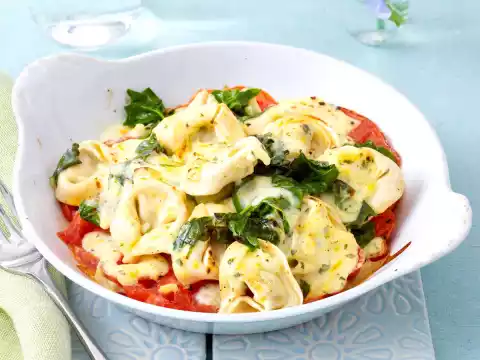 Wash the spinach. Cook the tortelloni according to the instructions on the packet. Collapse the spinach in pasta water, drain. Wash the tomato, cut into slices. Place in a casserole dish with tortelloni mix and sauce.