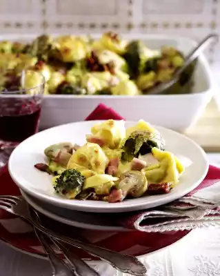 Peel onion and cut into small cubes. Cut ham into cubes. Cut tomatoes roughly into strips. Mix tortelloni, vegetables, ham and sauce and fill into a greased casserole dish. Grate cheese and sprinkle on the casserole. Bake in a preheated oven (electric cooker: 200 °C/ convection oven: 175 °C/ gas: level 3) for 20-30 minutes