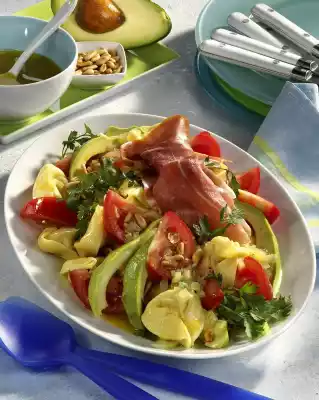 Place the tortelloni in boiling salted water and cook at low heat for 1-2 minutes. Then pour into a sieve, rinse with cold water and drain well. Roast pine nuts in a small pan without fat while turning. Clean, wash and slice the tomatoes. Cut avocado in half, peel and remove the stone. Then cut the flesh into slices and sprinkle with lemon juice.