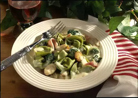 Deglaze with milk and stock and bring to the boil. Add broccoli and mushrooms to the sauce and simmer for about 5 minutes. Bring about 2 litres of salted water to the boil and let the pasta simmer for 5-8 minutes. Season the sauce with salt and pepper. Add cheese and let it melt while stirring. Warm the ham in the sauce. Drain the noodles and serve with the sauce