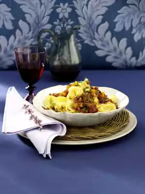 Cook the pasta in boiling salted water according to the instructions on the packet. Pour into a sieve and drain. Arrange tortelloni and turnip bolognese on plates, sprinkled with the remaining celery green