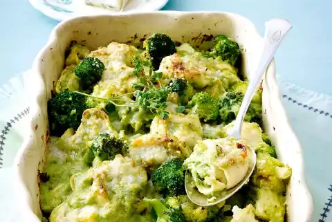 Some broccoli and pine nuts give the creamy cheese sauce a special note.