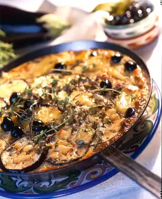 Wash thyme, chop roughly. Put the potatoes, aubergines and zucchini in an ovenproof pan greased with olive oil, sprinkle with some cheese and thyme. Spread olives on top. Pour egg milk over it. Sprinkle with the remaining cheese and thyme. Let stand in the preheated oven (electric cooker: 200 °C/ gas: level 3) for about 20 minutes and serve