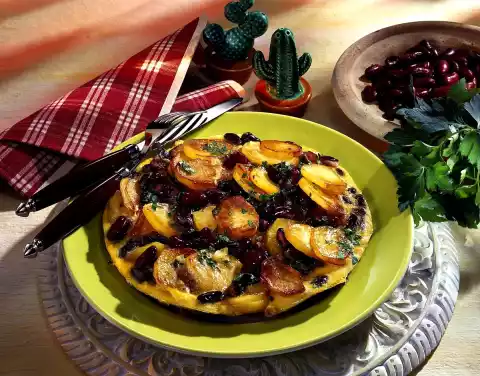 Put the beans in a sieve, rinse and drain. Add onion, garlic and beans to the potatoes and fry for another 5 minutes. Season with salt and pepper. Mix eggs and milk. Season with salt and pepper and pour over the potatoes.