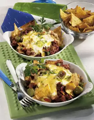 Cut the olives in half lengthwise. Fill chips, chopped mass and olives into 4 oiled ramekins. Stir the sour cream until smooth and spread over the top. Grate cheese and sprinkle over it