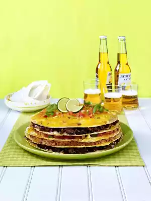 Ofen auf 400ºF erhitzen. Backblech mit Folie auslegen. Mit Kochspray bestreichen. In einer Schüssel geriebenen Käse zusammenschütten. 1 Tortilla auf das Backblech legen. Mit ½ Tasse Käsemischung bestreuen. Mit der Hälfte der Rindfleisch/Bohnen-Mischung bestreichen. Mit der zweiten Tortilla bedecken. Mit ½ Tasse Käse und der Hälfte des Reises bestreuen. Mit der dritten Tortilla bedecken. Mit ½ Cup Käse und der Hälfte der Zucchini-Tomaten-Mischung bestreuen. Mit der vierten Tortilla bedecken. Mit ½ Cup Käse und Rindfleischmischung bestreichen. mit fünfter Tortilla bedecken. Mit ½ Cup Käse und dem restlichen Reis bestreichen. Mit der sechsten Tortilla bedecken. Mit ½ Cup Käse und der restlichen Zucchini/Tomaten-Mischung bestreichen. Mit restlicher Tortilla bedecken. Die restlichen Tomaten und die Hälfte der Schalotte über die Tortilla verteilen. Mit dem restlichen Käse bedecken. 5 Min. backen, oder bis der Käse auf der Oberseite geschmolzen und durcherhitzt ist. Mit Frühlingszwiebeln, Limettenscheiben und Koriander garnieren.