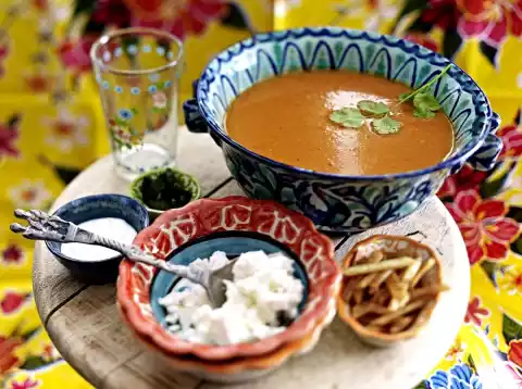 Puree the soup with a hand blender. Season to taste with salt, pepper and sugar. Wash the coriander, shake dry and sprinkle over the soup. Serve the soup as desired with the side dishes.